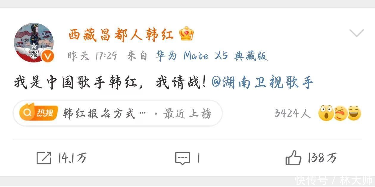 除了李玟,其他以唱歌著称的歌手,比如张校友、陈奕迅、林俊杰、张惠妹的咖位都不输那英。而那英的那些国度队的同门,思来也有能手。此次手脚国度队的又一大咖,韩红高调恳求出战,真的是很有爱国情感了。可惜之前她也曾插足过歌手,再请她就有点黔驴之计的嗅觉!